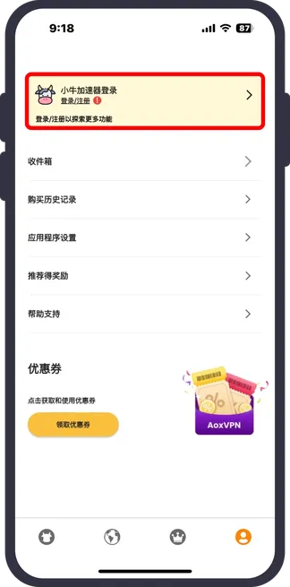 下载并打开 App → 点击 “账户” 图像 → 然后点击 “登录/注册” 按钮