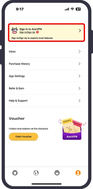 Download and open the app → tap the "Profile" icon → then tap "Sign In/Sign Up" button.
