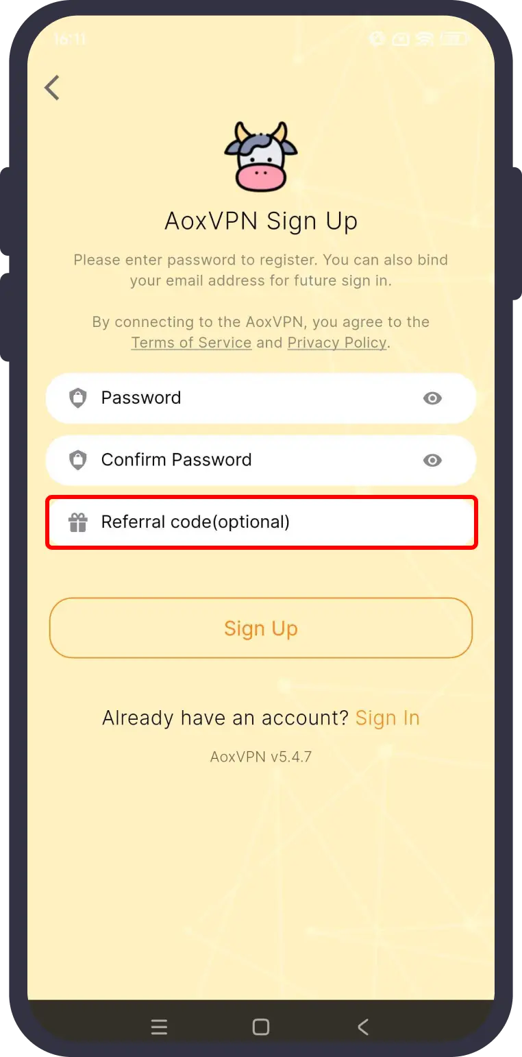 On the sign-up page, paste the referral code and complete your account registration.