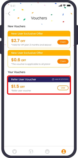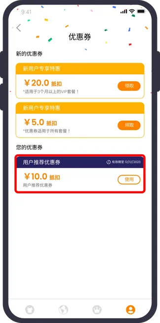 使用好友推荐码成功注册后,你将获得代金券。